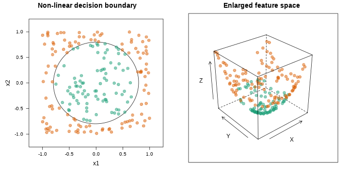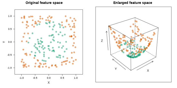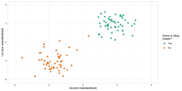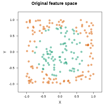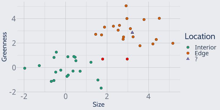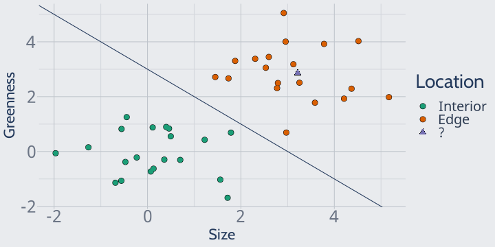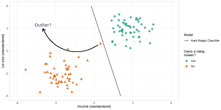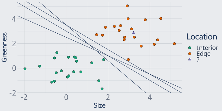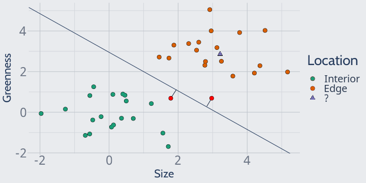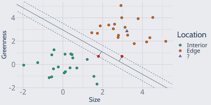 class: center, middle, inverse, title-slide # MLCA Week 11: ## Support Vector Machines ### Mike Mahoney ### 2021-11-10 --- Before we get started, I've got a little bit of housekeeping to go over. This is our last week of regular class. The next two classes (weeks 12 and 13) are dedicated time to work on your course project. I'll still be in Bray 300 during class time if you have questions or want help with your project, and I'll still be holding my regular office hours. That said, if you don't think coming to class will be a productive way for you to spend your time, that's totally fine. Four weeks from now (week 14, 2021-12-08, our last day of class) everyone will share their final presentation on the project. You should hand in all your files (report, data, and code) by the start of that class. --- Your final presentation should be about five minutes (or less). Ideally you'll talk about the problem you wanted to solve, the methods you used, and how well it went. You can use slides if you want, or you can feel free to just talk about your project for five minutes. The presentations are meant as an opportunity for us to find out what everyone else has been working on; they should not feel like a high-stakes event. Your code should run immediately when I load it on my computer and return the same results as you report; this means no hard-coded file paths or `setwd` calls (use the "here" package instead) and `set.seed` used before randomization. As usual, feel free to reach out with any questions or concerns. --- class: center middle # Support Vector Machines --- .bg-washed-green.b--dark-green.ba.bw2.br3.shadow-5.ph4.mt5[ Rule 1. New methods always look better than old ones. Neural nets are better than logistic regression, support vector machines are better than neural nets, etc. In fact it is very difficult to run an honest simulation comparison, and easy to inadvertently cheat by choosing favorable examples, or by not putting as much effort into optimizing the dull old standard as the exciting new challenger. Rule 2. Complicated methods are harder to criticize than simple ones. By now it is easy to check the efficiency of a logistic regression, but it is no small matter to analyze the limitations of a support vector machine. .tr[ — [Brad Efron: Comment on Statistical Modeling: The Two Cultures](https://projecteuclid.org/journals/statistical-science/volume-16/issue-3/Statistical-Modeling--The-Two-Cultures-with-comments-and-a/10.1214/ss/1009213726.full) ] ] --- class: middle We're wrapping up this course with one final type of model, the **support vector machine** (or SVM). SVMs are our second kernel-based method, and the most common kernel-based method in use today. SVMs are highly flexible, robust to outliers, and are resilent to overfitting. However, they can also be slow to train, particularly on data sets with many observations. As a result, SVMs are often viewed as more specialized models than random forests and GBMs. If nothing else is working right, it might be time to try an SVM. --- But before we get into all that, let's go back to our fake data from last week: <br /> <!-- --> --- Last week, we focused on classifying our mystery points (the purple triangle) based on its nearest neighbors -- if the majority of neighbors nearby were edge plants, we'd predict an edge plant. But there might be an easier way to classify things. There's a big gap between our two classes -- what if we drew a line across it? <!-- --> --- Now instead of having to find the neighbors for each point we want to predict, we can just look at where the point falls compared to the line. If the point is above the line, it's an edge plant; if it's below, it's an interior plant. When our data can be separated into two classes by a straight line, we call it **linearly separable**. We can think of the line as a **decision boundary**, because our predictions depend entirely on what side of the boundary a point falls. For instance, our mystery point here falls on the "Edge" side of the boundary, so we'd classify this point as an edge plant. <!-- --> --- Another name for this line is a **separating hyperplane**. Remember from way back in week 2 that we can call model surfaces in any dimension a hyperplane; rather than directly modeling an outcome or probability, however, these hyperplanes are trying to split our data into two classes. <!-- --> --- But how do we choose where to draw the decision boundary? There are many possible different separating hyperplanes that perfectly classify our data: <!-- --> Which one would we want to use as a decision boundary? --- Just by looking at the graph, we can tell that some of these hyperplanes seem "better" than others. How can we choose the "best"? One approach is to choose the hyperplane that is the _furthest_ from both classes. That _should_ maximize how generalizable the decision boundary is, so that a point with X and Y values a bit further out from the class mean will still be correctly classified. In order to find that furthest line, we need to first find the points from each class which are closest to the _other_ class: <!-- --> --- Then we draw the line that maximizes the distance of _both_ of those points from the line. We call this decision boundary the **optimal separating hyperplane**, and the points we use to draw it **support vectors**. <!-- --> --- This method maximizes the distance between the two classes (the area between the dotted lines, also known as a **margin**). Because we're drawing our decision boundary so that no points are inside the margin and no points are misclassified, we call this a **hard margin classifier**. This is the simplest version of a **support vector machine**. <!-- --> --- This simple hard-margin SVM has some weaknesses. For instance, let's look at a different data set, showing how income and lot size are associated with riding lawnmower ownership: <!-- --> (This graph adapted from [Hands-on Machine Learning with R](https://bradleyboehmk